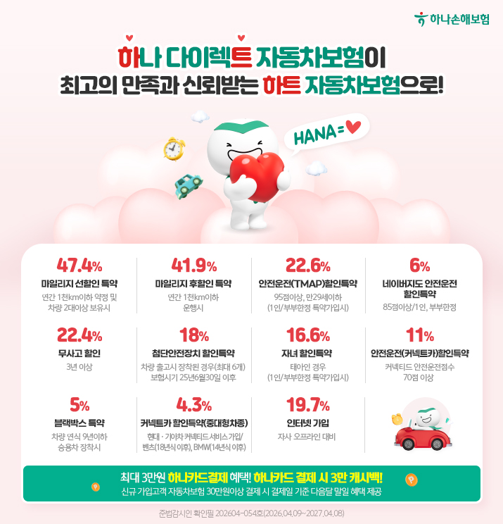 하나손해보험(주)는 상품을 충분히 설명할 의무가 있으며, 계약자는 보험을 가입하기 전에는 충분히 설명 받으시기 바랍니다.
