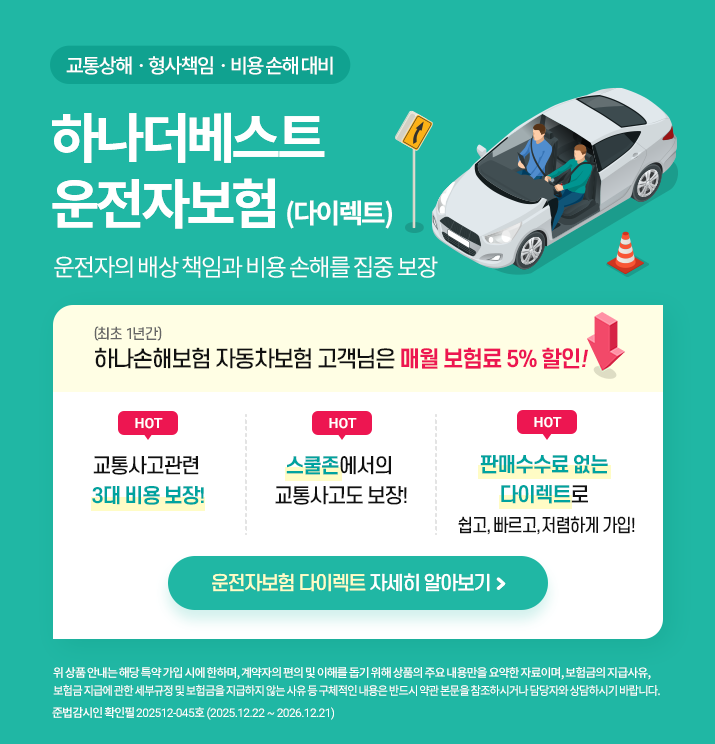 하나손해보험(주)는 상품을 충분히 설명할 의무가 있으며, 계약자는 보험을 가입하기 전에는 충분히 설명 받으시기 바랍니다.